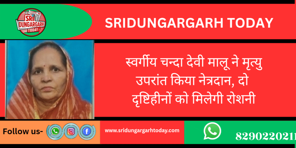समाजसेवा और मानवता की मिसाल पेश करते हुए आड़सर बास, श्रीडूंगरगढ़ निवासी स्वर्गीय चन्दा देवी मालू (आयु 65 वर्ष), धर्मपत्नी हुलासमल मालू ने अपने निधन के उपरांत नेत्रदान कर एक पुनीत कार्य किया। यह नेत्रदान प्राणनाथ अस्पताल की नेत्रदान संस्था के माध्यम से विधिवत संपन्न हुआ।