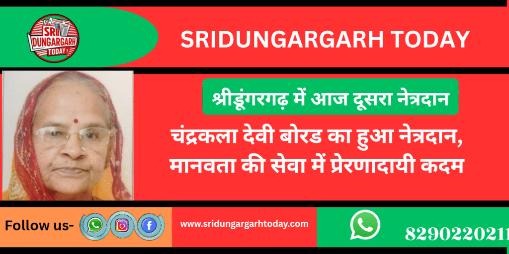 समाजसेवा और मानवता की दिशा में एक अनुकरणीय उदाहरण प्रस्तुत करते हुए स्वर्गीय चंद्रकला देवी बोरड का निधन उपरांत नेत्रदान संपन्न हुआ। इस पुनीत कार्य की स्वीकृति उनके पति भीकमचंद बोरड तथा पुत्र सुरेंद्र बोरड, नरेंद्र बोरड एवं रवि बोरड ने प्रदान की। जिससे दो नेत्रहीन व्यक्तियों को दृष्टि मिलने की संभावना बनी है।