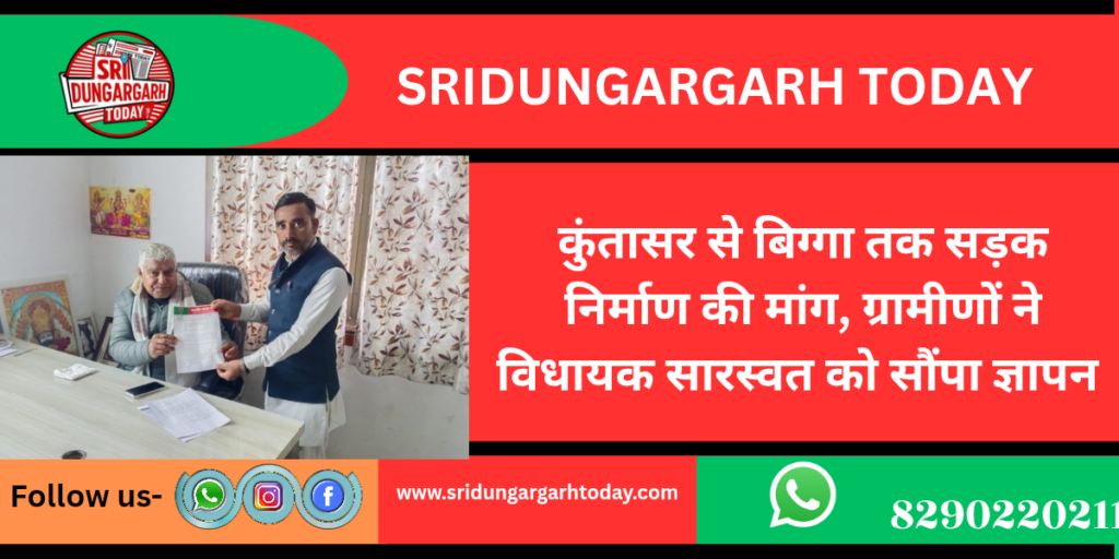 क्षेत्र के गांव कुंतासर में ग्रामीणों ने आरसीसी सड़क निर्माण की मांग को लेकर सोमवार को मेघराज सोनी सामाजिक कार्यकर्ता व भाजपा महामंत्री मोमासर मंडल की अगुवाई में विधायक ताराचंद सारस्वत को ज्ञापन सौंपा ग्रामीणों ने बताया कि कुन्तासर में बने आगनबाड़ी केन्द्र से बिग्गा की तरफ जाने वाला मार्ग जो आज तक कच्चा रास्ता ही है। जिसके कारण बिग्गा तरफ जाने वाले आमजन को भारी परेशानी का सामना करना पड़ता है, तथा आगनबाड़ी केन्द्र से बिग्गा की तरफ जाने वाले मार्ग की कुल लंबाई तकरीबन 1000 फुट है जो कि कच्च रास्ता होने के कारण आवागमन दुर्लभ हो गया है। ग्रामीणों ने ग्राम कुन्तासर से आडिया मार्ग जो कि बिग्गा से सटीक लगता है। इस मार्ग पर आरसीसी सड़क का निर्माण करवाकर आम लोगों को राहत प्रदान करने की मांग की। विधायक सारस्वत ने ग्रामीणों को सकारात्मक आश्वासन देते हुए जल्द ही कार्य शुरु करने का भरोसा दिलाया। इस दौरान बनवारीलाल, गणेश,रामनिवास ,सांवरमल , भागीरथ सहित अनेक ग्रामीण मौजूद रहे।