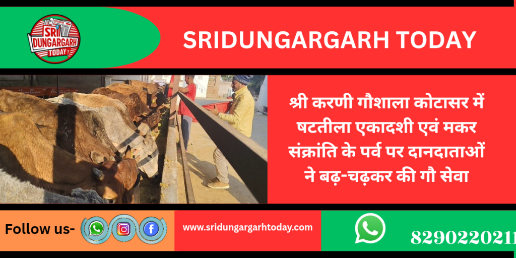 बुधवार को षटतीला एकादशी एवं मकर संक्रांति के अवसर पर गांव कोटासर की श्री करणी गौशाला में गौ भक्तों ने बढ़-चढ़कर गौसेवा की। श्रद्धालु सुबह से ही गौशाला में पहुंचकर गौसेवा शुरू की जो संध्याकालीन बेला तक लगातार चलती रही। गौशाला प्रबंधक ने बताया कि गौशाला के भामाशाह राजेंद्र कुमार जोशी गंगा शहर ने एक कढ़ाई तिल मिश्रित खल का भंडारा किया। स्वर्गीय रामेश्वर लाल सुपुत्र रेवंत राम छड़िया सुथार कुचोर अगुणी की पुण्य स्मृति में उनकी बेटी नैना सुथार, दोहिते खुशवंत सुथार ने गोवंश को लापसी भंडारा समर्पित किया। वहींं बीकानेर से गुप्त दान के रूप में दो कार्टून महाकोष तेल एवं एक गुड़ का कट्टा समर्पित किया गया। रतन सिंह हाडा मुसलकी, पीटीआई जनार्दन शर्मा बुहाना, राजेंद्र प्रसाद सोनी दुलचासर हाल पुणे, रामेश्वर लाल सुथार दुलचासर हाल मुंबई, रामेश्वर लाल छड़िया सुथार कुचोर अगुणी हाल चेन्नई, मनोज कुमार गणेशाराम सुथार दुलचासर, मोडाराम जी महिया सरपंच प्रतिनिधि दुलचासर, राजूराम गोदारा राजूराम भादू सूडसर, ठेकेदार गणेश मल सुथार दुलचासर हाल मुंबई, सुरेश धारणिया सहित सभी दानदाताओं ने गोवंश को एक-एक पेटी गुड़ की सेवा समर्पित कर गौ सेवा का सौभाग्य प्राप्त किया गौशाला कमेटी ने सभी दानदाताओं का जताया आभार। गौशाला प्रबंधक ने बताया कि कल 15 जनवरी को मकर संक्रांति का पर्व धूमधाम से मनाया जाएगा। वैदिक मंत्रोचार के साथ होगा हवन अनुष्ठान एवं मां कामाख्या मंडल सेवा समिति की ओर से सैकड़ो कंबल गो सेवा में समर्पित किए जाएंगे एवं कई भामाशाहों के द्वारा मीठी लापसी भंडारा, गुड़, तिल इत्यादि का विशाल गौ भंडारा होगा एवं महिला सत्संग मंडली के द्वारा भजन कीर्तन के साथ गौ सेवा का कार्य सामूहिक रूप से दानदाताओं के द्वारा किया जाएगा।
