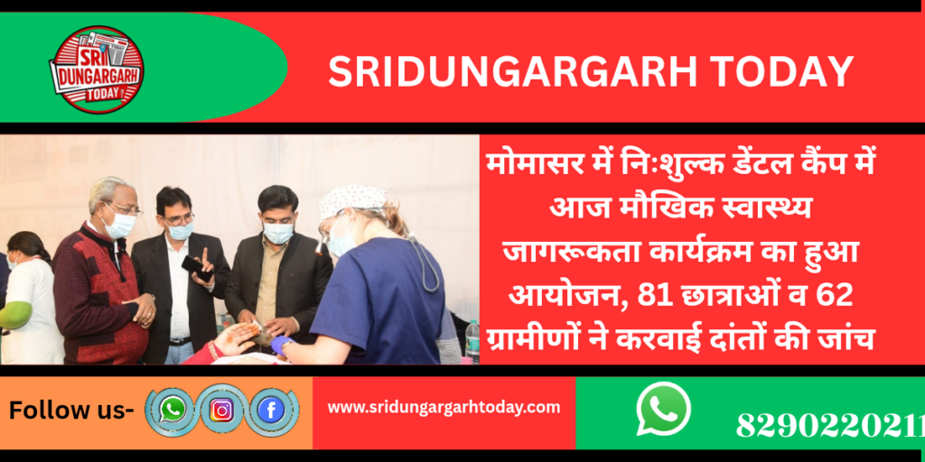 मोमासर में स्तिथ इचरज देवी पटावरी बालिका उच्च माध्यमिक विद्यालय)। सुरवि चैरिटेबल ट्रस्ट द्वारा आयोजित निःशुल्क डेंटल कैंप के अंतर्गत आज विद्यालय की छात्राओं एवं ग्रामवासियों के दांतों की जांच एवं मौखिक स्वास्थ्य जागरूकता कार्यक्रम आयोजित किया गया।