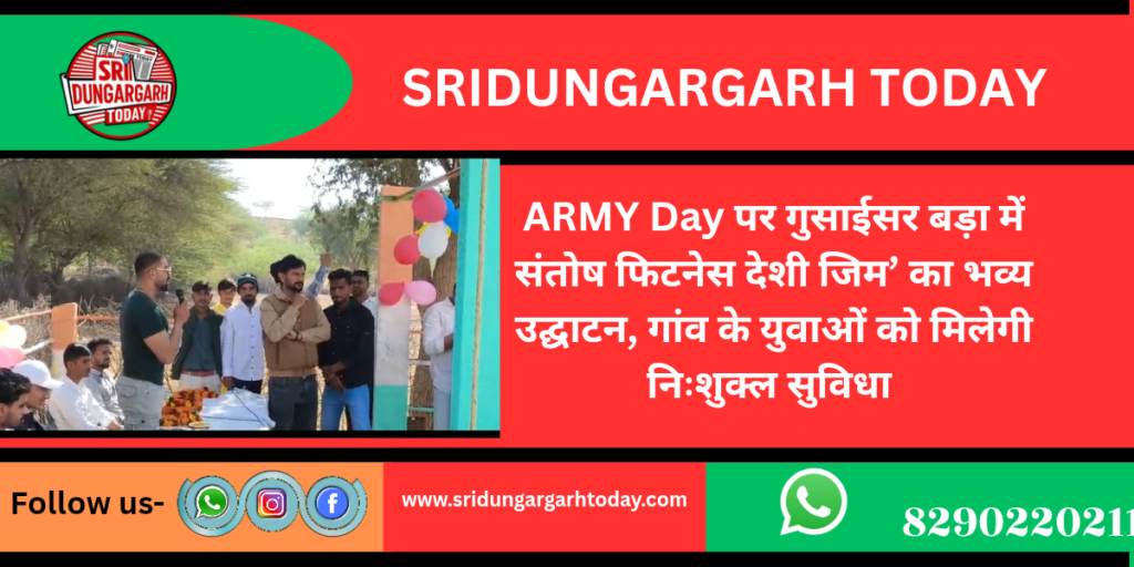 ARMY Day के शुभ अवसर पर गुसाईसर बड़ा गांव के कानेरा बास में संतोष फिटनेस देशी जिम का भव्य उद्घाटन समारोह आयोजित किया गया। कार्यक्रम में गुसाईसर सहित आसपास के क्षेत्रों से भी बड़ी संख्या में  ग्रामीण पधारे