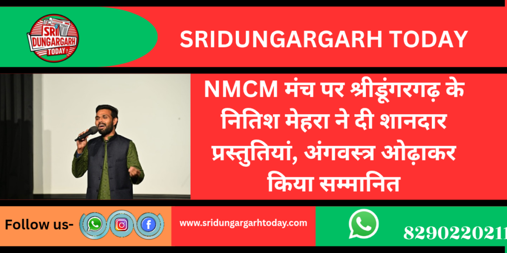 इस दौरान भव्य सांस्कृतिक कार्यक्रम में श्रीडूंगरगढ़ क्षेत्र के गांव धीरदेसर पुरोहितान के नितिश मेहरा ने भी भाग लिया नितीश ने सुमधुर गायन प्रस्तुति से एरी सखी,जय हो, वो भारत देश है मेरा सहित अनेक पंजाबी गानो से सभी को मंत्रमुग्ध कर दिया जिस पर सभागार तालियों की गड़गड़ाहट से गूंज उठा। उनकी इस प्रस्तुति के लिए अंगवस्त्र ( दुप्पटा) ओढ़ाकर सन्मानित कया गया।