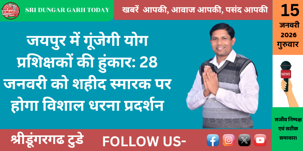 राजस्थान योग प्रशिक्षक महासंघ के तत्वावधान में प्रदेश भर के योग प्रशिक्षक अपनी वाजिब मांगों को लेकर आर-पार की लड़ाई के मूड में हैं। आगामी 28 जनवरी 2026 (गुरुवार) को राजधानी जयपुर के शहीद स्मारक पर महासंघ द्वारा एक विशाल धरना प्रदर्शन का आयोजन किया जाएगा।