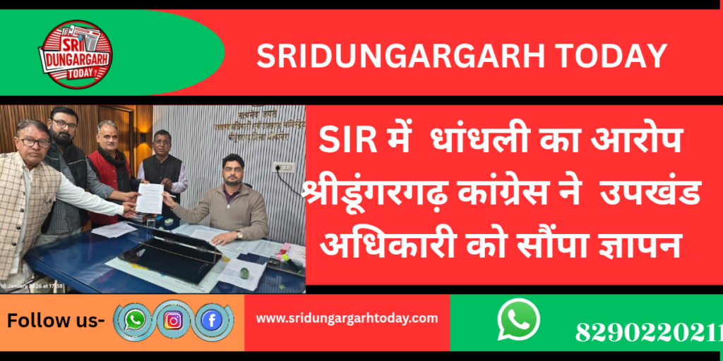 प्रदेश कांग्रेस कमेटी के निर्देशानुसार चुनाव आयोग द्वारा चल रही SIR (स्पेशल इंटेंसिव रिवीजन) प्रक्रिया में कथित धांधली के विरोध में शुक्रवार को श्रीडूंगरगढ़ कांग्रेस कमेटी ने उपखंड अधिकारी शुभम शर्मा को ज्ञापन सौंपा।