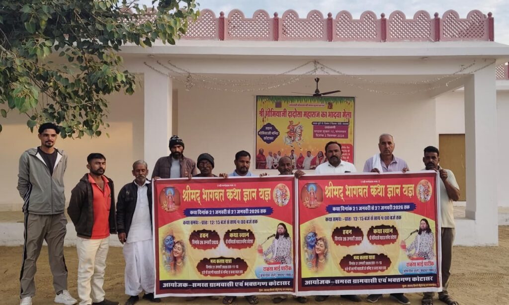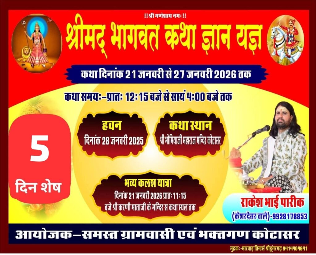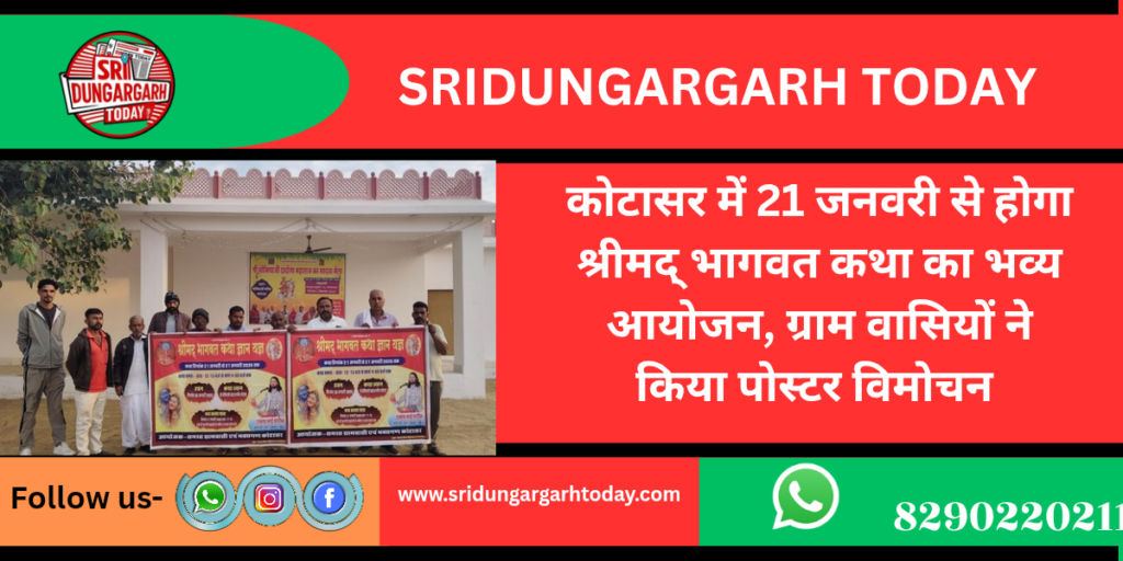 गांव कोटासर के भोमिया जी दादोसा महाराज के मंदिर परिसर में आगामी 21 जनवरी 2026 से श्रीमद् भागवत कथा का भव्य आयोजन होगा। कथा का वाचन पंडित राकेश भाई पारीक केशरदेसर करेंगे कथा को लेकर आज गांव के मुख्य गुवाड़ में ग्राम वासियों ने पोस्टर का विमोचन किया। इस अवसर पर माल सिंह राठौड़, हरदास रामावत मूलाराम सारण, जगदीश प्रसाद जोशी, श्याम सुंदर जोशी मदनलाल जोशी, प्रेम सिंह चौहान, राजू सिंह राठौड़ बुधराम, जालू राम ,जेठू सिंह, अमर सिंह, लक्ष्मण सिंह पूनम चंद, सरवन राम,हनुमान राम सहित अनेक ग्रामीण मौजूद रहें । अगरसिंह कोटासर ने बताया कि कथा के प्रचार-पसार व व्यवस्था के लिए गांव के युवाओं को जिम्मा दिया गया है। जिसके लिए अलग -अलग टोलिया बनाई गई। कथा की तैयारियां जोरों शोरो से चल रही है।