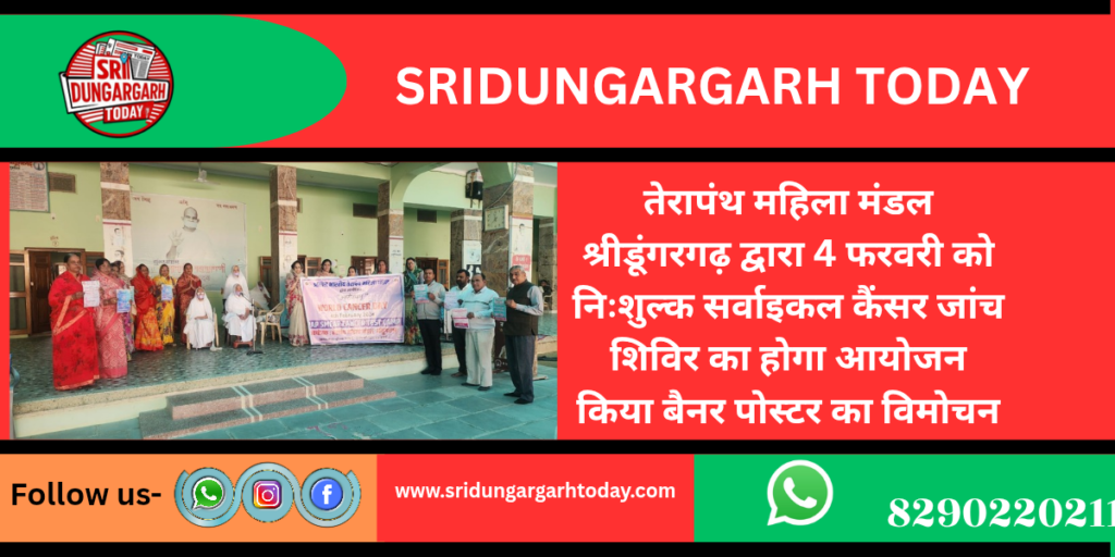 तेरापंथ महिला मंडल श्री डूंगरगढ़ द्वारा रविवार को स्थानीय मालू भवन सेवा केंद्र में कैंसर अवेयरनेस प्रोग्राम के अतंर्गत आयोजित होने वाले सर्वाइकल कैंसर जांच शिविर को लेकर बैनर तथा पोस्टर्स का अनावरण किया गया। कार्यक्रम केंद्र व्यवस्थापिका साध्वी संगीत श्री जी एवं साध्वी डॉ परम प्रभा जी के सानिध्य में सम्पन्न हुआ