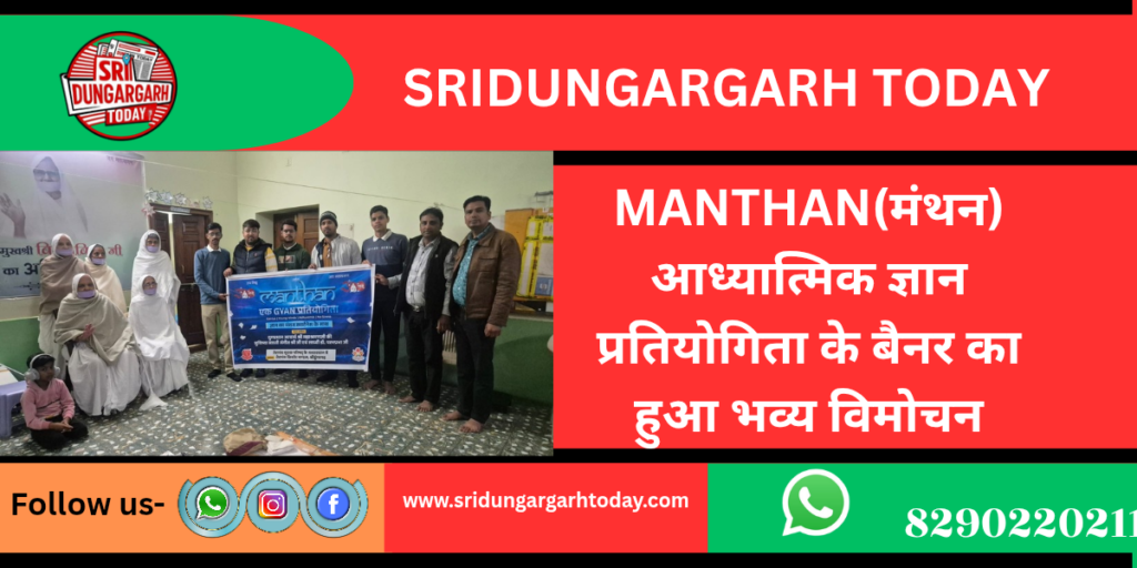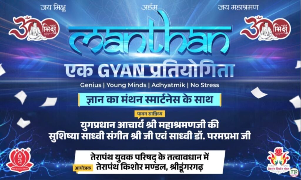 तेरापंथ युवक परिषद् के तत्वावधान में तेरापंथ किशोर मंडल, श्रीडूंगरगढ़ द्वारा आध्यात्मिक ज्ञान प्रतियोगिता “MANTHAN” का आयोजन किया जाएगा। प्रतियोगिता के बैनर का विमोचन गुरुवार को साध्वी संगीतश्री जी एवं साध्वी डॉ. परमप्रभा जी के पावन सानिध्य में किया गया। दोनों साध्वियों ने प्रतियोगिता को ज्ञान, चिंतन एवं आत्मविकास की दिशा में एक महत्वपूर्ण पहल बताते हुए आयोजक टीम को शुभाशीर्वाद प्रदान किया।