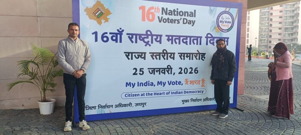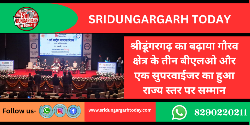 राजस्थान राज्य निर्वाचन आयोग के द्वारा आज सोलहवें राष्ट्रीय मतदाता दिवस पर राष्ट्रीय मतदाता दिवस के  राज्य स्तरीय कार्यक्रम में मतदाता सूची के विशेष गहन पुनरीक्षण अभियान में श्रेष्ठ कार्य करने वाले राज्यभर के सेक्टर सुपरवाइजर्स और बीएलओ का गरिमामय सम्मान कार्यक्रम जयपुर में रखा गया जिसमें माननीय राज्यपाल श्री हरिभाऊ बागड़े मुख्य अतिथि,मुख्य निर्वाचन आयुक्त श्री राजेश्वर सिंह विशिष्ट अतिथि और राज्य मुख्य निर्वाचन अधिकारी श्री नवीन महाजन विशिष्ट अतिथि रहे।श्रीडूंगरगढ़ विधानसभा क्षेत्र से सुपरवाईजर सीताराम गोदारा व्याख्याता राउमावि बाडेला, बीएलओ श्रवण कुमार शर्मा अध्यापक राउमावि उदरासर , रणजीत सिंह कृषि पर्यवेक्षक जोधासर, इन्द्रचन्द शारीरिक शिक्षक राउप्रावि शीतलनगर का सम्मान किया गया। इन चारों कार्मिकों ने निर्वाचन के महत्वपूर्ण कार्य में श्रेष्ठतम कार्य करके क्षेत्र का गौरव बढ़ाया है। श्री शुभम शर्मा उपखंड अधिकारी श्रीडूंगरगढ़ ने क्षेत्र के कार्मिकों के राज्य स्तर पर सम्मानित होने पर शुभकामनाएं देते हुए इनके कार्य को सभी के लिए प्रेरणीय बताया।