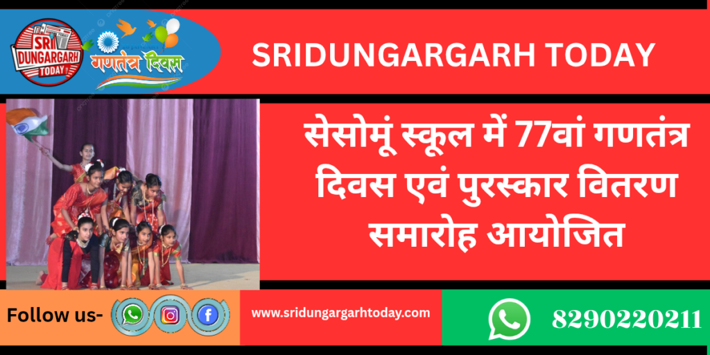 श्रीडूंगरगढ़। 77वें गणतंत्र दिवस के अवसर पर श्री शुभम शर्मा, उपखंड अधिकारी, श्रीडूंगरगढ़ की अध्यक्षता में आयोजित उपखंड स्तरीय समारोह में सेसोमूं स्कूल के विद्यार्थियों ने उत्कृष्ट प्रदर्शन कर विद्यालय का नाम गौरवान्वित किया।