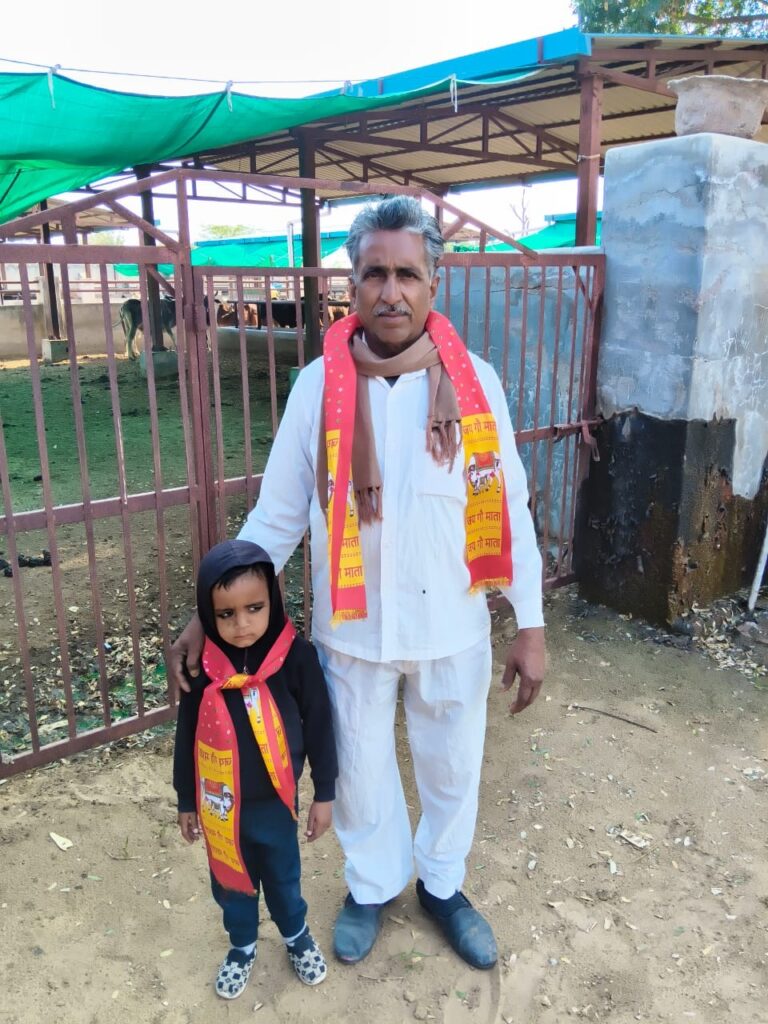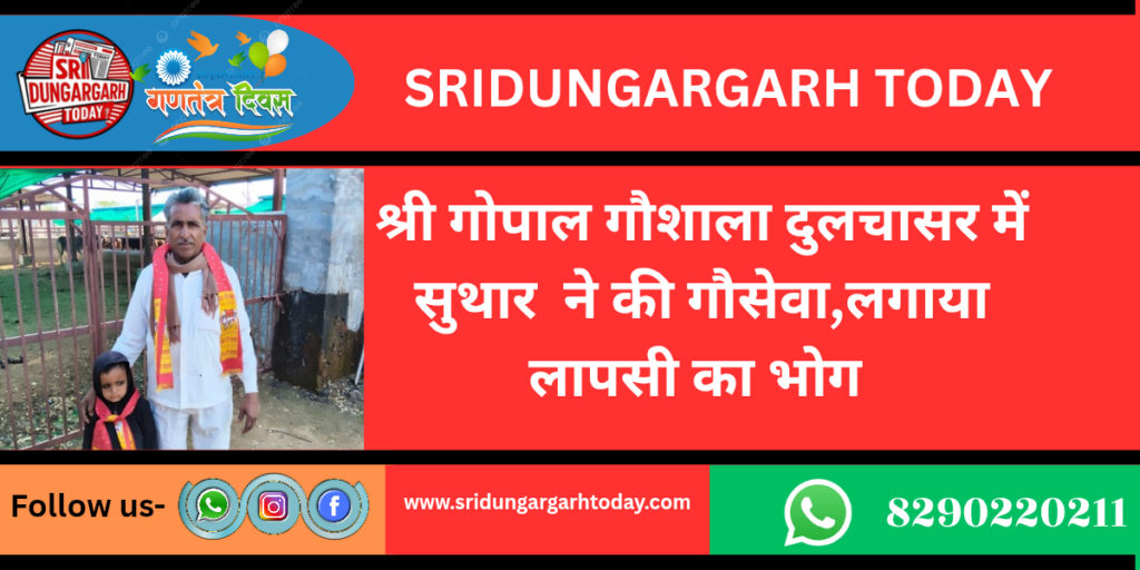 श्री गोपाल गौशाला दुलचासर में तोलाराम सुपुत्र मोडाराम सुथार नागल निवासी दुलचासर अपने पोते दीक्षित के साथ गौशाला में पधारध कर गौसेवा की इस अवसर पर  गौशाला की  गौमाताओं  को पौष्टिक आहार लापसी का पावन भंडारा कर अपने हाथों से भोग लगाया। सचिव रेवंतसिंह पड़िहार ने बताया कि सुथार नागल परिवार ने लापसी सामग्री गेहूं बाट 65 किलो गुड़ एक पेटी, 5 किलो सरसों तेल गौशाला में समर्पित कर लापसी बनवाकर भोग लगाया। गौशाला कमेटी ने सुथार परिवार का दुपट्टा पहनाकर स्वागत आभार प्रकट करते हुए ईश्वर से सदैव सुख समृद्धि कि कामना की।
