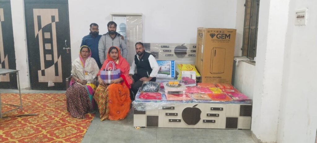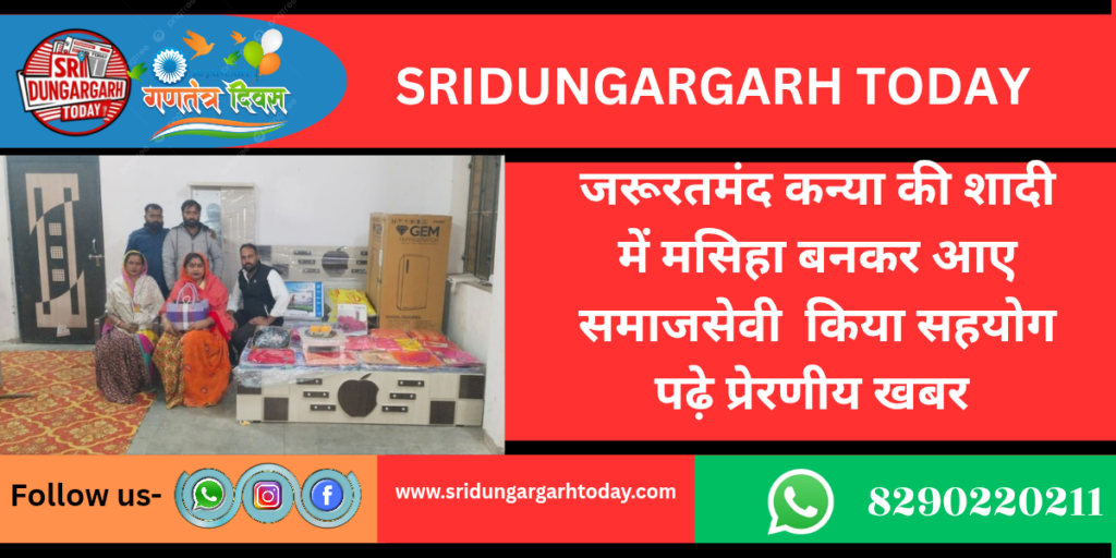 श्रीडूंगरगढ़ के सक्रिय युवा सेवादारों ने गांव की जरूरतमंद बेटी की शादी में जरूरत का सामान देकर उसकी मुस्कान लौटा दी । इस दौरन सदस्यों द्वारा कुल 33800 रुपये की राशि एकत्रित की गई। और गांव की बेटी की शादी के लिए इस राशि से चांदी की पायल, दो हाथ घड़ी, फ्रिज, बेड, ड्रेसिंग टेबल, एलईडी टीवी, दो दीवार घड़ी खरीदी गई। मोमासर बास की राखी बाई भी आगे आई व इस पुनीत कार्य में सहयोगी बनते हुए सामान के लिए 5100 रूपए सहित थाली में 3100 रूपए एक जोड़ी चांदी की पायल व 11 साड़ियां, बेडशीट भेंट दी। गोभक्त आनंद जोशी ने बताया कि एक जरूरतमंद कन्या विवाह बीती रात को विवाह था तथा परिवार विवाह में बेटी को देने के लिए उचित व्यवस्था नहीं कर पाया। परिवार की स्थिति देखकर उनके जानकारों ने उनसे संपर्क किया ।आनंद ने बताया कि इस कार्य में वे स्वयं व सुभाष जावा, श्याम गिरी व सीमा ने मदद का हाथ बढ़ाया। इन्होंने अनेक लोगों से संपर्क किया और जिसमें ₹7100 पालिकाध्यक्ष मानमल शर्मा ने , ₹5100 एसआई हरिश गुर्जर,₹ 5100 प्रदीप तंवर बीकानेर, ₹2100 कविता मारू, ₹ 5100महेंद्र राजपूत, ₹2100 कुलदीप चौधरी, ₹1100 सरपंच सुनील दुगरिया, ₹ 2100मनफुल दर्जी,₹5100 सुंदरमल मोट सहित कई अनेक लोगों ने गुप्त दान के रूप में मसीहा बनकर आगे आए। सेवादारों ने बारात आगमन से कुछ देर पहले ही कन्या के घर पहुंचे और सारा सामान सौंप कर गणतंत्र दिवस की पूर्व संध्या पर जरूरतमंद परिवार की मदद कर योगदान दिया। वधू के परिवार ने जब बारात दरवाजे पर खड़ी है और वधू के लिए कोई उपहार नहीं, ऐसे में मिली इस सहायता के लिए तहेदिल से सभी का आभार जताया।