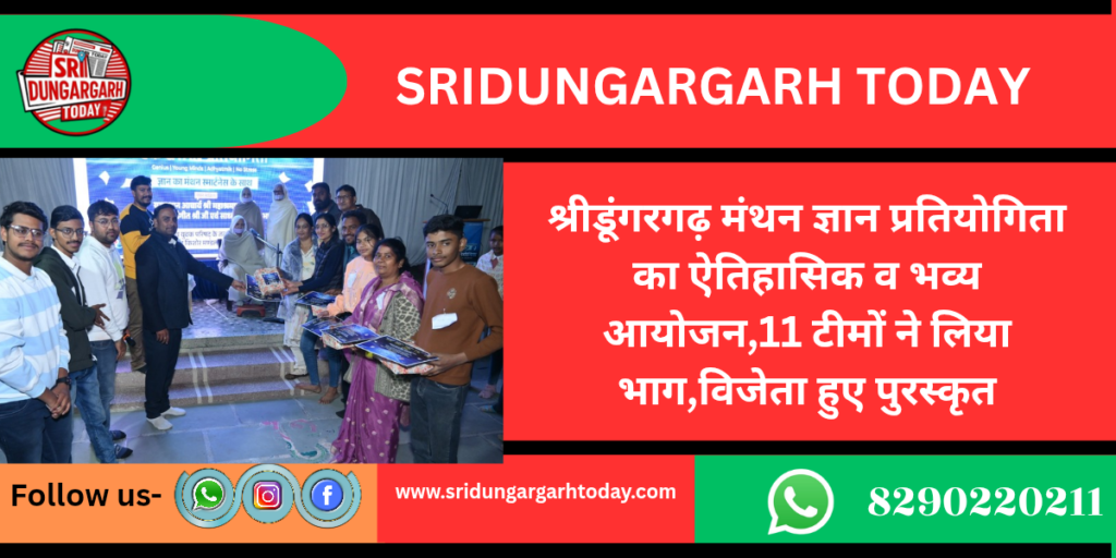 श्रीडूंगरगढ़ में मंथन – एक ज्ञान प्रतियोगिता का आयोजन अत्यंत उत्साह, अनुशासन एवं आध्यात्मिक वातावरण के साथ ऐतिहासिक रूप से संपन्न हुआ। इस अनूठी प्रतियोगिता में कुल 11 टीमों ने भाग लिया और 10 राउंड में अपने टीम वर्क, आध्यात्मिक ज्ञान, सूझ-बूझ एवं विवेक के माध्यम से विभिन्न स्तरों को पार करते हुए उत्कृष्ट प्रदर्शन किया।