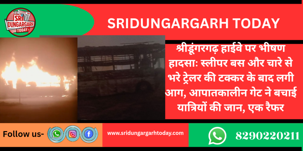 श्रीडूंगरगढ़ नेशनल हाईवे सेसोमू स्कूल के पास बुधवार तड़के एक बड़ा सड़क हादसा हो गया। जयपुर से बीकानेर जा रही एक स्लीपर बस और चारे से भरे ट्रेलर के बीच जोरदार टक्कर हो गई। टक्कर इतनी भयानक थी कि दोनों वाहनों में मौके पर ही आग लग गई। बस में सवार यात्रियों में अफरा-तफरी मच गई, लेकिन बस में बने आपातकालीन द्वार (Emergency Exit) की वजह से बड़ी संख्या में यात्रियों की जान बच गई। यह हादसा सुबह करीब 5:15 बजे हुआ और हादसे के बाद हाईवे पर लगभग दो घंटे तक यातायात बाधित रहा। फायर ब्रिगेड और पुलिस की टीम ने कड़ी मशक्कत के बाद आग पर काबू पाया।