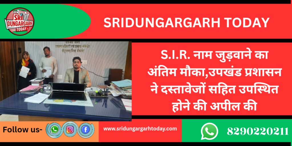 उपखंड अधिकारी शुभम शर्मा ने बताया कि एसआईआर के परिगणना चरण में जिन निर्वाचकों की पिछली निर्वाचक नामावली से स्वयं, माता-पिता या दादा-दादी के स्तर पर मैपिंग नहीं हो पाई है, ऐसे मतदाताओं को अपना नाम अंतिम मतदाता सूची में बनाए रखने के लिए निर्वाचन आयोग द्वारा निर्धारित आयु अनुसार मूल दस्तावेज प्रस्तुत करना अनिवार्य है। इसके लिए उन्हें उपखंड अधिकारी कार्यालय/तहसील कार्यालय श्रीडूंगरगढ़ में संबंधित अधिकारी के समक्ष उपस्थित होकर दस्तावेज जमा कराने होंगे। संबंधित निर्वाचक इस पर विशेष ध्यान दें।