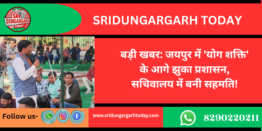 राजधानी जयपुर के शहीद स्मारक पर आज राजस्थान योग प्रशिक्षक महासंघ के बैनर तले उमड़े सैकड़ों योग प्रशिक्षकों के जनसैलाब ने सरकार को वार्ता की मेज पर आने को मजबूर कर दिया। सुबह जो माहौल “ईंट से ईंट बजाने“ की चेतावनी और आक्रोश से भरा था, वह शाम होते-होते “विजयी मुस्कान” और “सकारात्मक आश्वासन“ में बदल गया।