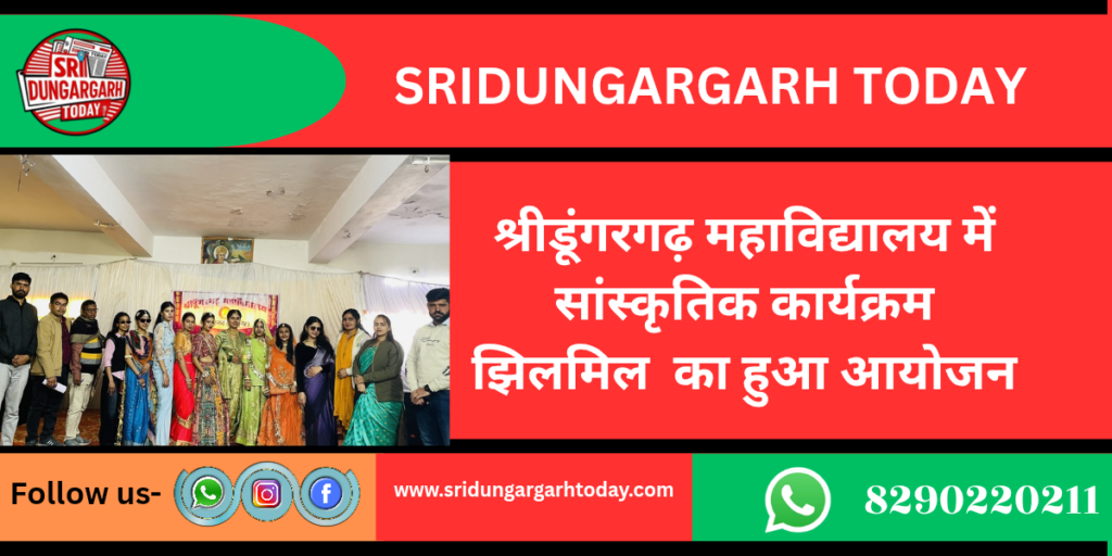 श्रीडूंगरगढ़। यहां के श्रीडूंगरगढ़ महाविद्यालय परिसर में वार्षिक सांस्कृतिक कार्यक्रम ‘झिलमिल’ का आयोजन किया गया। रंगारंग प्रस्तुतियों और उत्साह के बीच आयोजित इस कार्यक्रम में छात्र-छात्राओं ने अपनी प्रतिभा का जमकर प्रदर्शन किया। कार्यक्रम के मुख्य अतिथि प्रबंध समिति के सचिव श्याम महर्षि रहे। उन्होंने अपने संबोधन में छात्र-जीवन में सांस्कृतिक मूल्यों के महत्व पर प्रकाश डालते हुए कहा कि विद्यार्थियों को अपनी समृद्ध संस्कृति को बचाने का संकल्प लेना चाहिए। उन्होंने भविष्य में भी समय-समय पर ऐसे आयोजनों की आवश्यकता पर बल दिया। विशिष्ट अतिथि उपसचिव रामचंद्र राठी ने अपने प्रेरणादायी विचारों से विद्यार्थियों का मार्गदर्शन किया और उन्हें अनुशासन के साथ लक्ष्य प्राप्ति के लिए प्रेरित किया। कार्यक्रम की शुरुआत में प्राचार्य डॉ. विनोद सुथार ने सभी आगंतुक अतिथियों का स्वागत किया और अंत में धन्यवाद ज्ञापित किया। ‘झिलमिल’ कार्यक्रम के दौरान आयोजित विभिन्न प्रतियोगिताओं में विद्यार्थियों ने उत्साहपूर्वक भाग लिया। सबसे मुख्य आकर्षण मिस्टर और मिस फ्रेशर प्रतियोगिता रही। जिसमें महाविद्यालय के छात्र-छात्राओं को मिस श्रीडूंगरगढ़ व मिस्टर श्रीडूंगरगढ़ चुना गया। सांकृतिक प्रभारी पवन बाना व निशा धामा ने बताया की  मिस फ्रेशर  का खिताब चंद्रकांता व मिस्टर फ्रेशर का खिताब  भावेश कुमार ने जीता। एंव मिस्टर श्रीडूंगरगढ़ महेश स्वामी को चुना गया। कार्यक्रम में व्याख्याता सुनील आचार्य, डॉ. राजेश सेवग, यजत भारद्वाज, मुनेश जांगीड़, यूनिस खान, मनोज जांगिड़, मुकेश जांगिड़ और निशा स्वामी सहित महाविद्यालय का समस्त स्टाफ व विद्यार्थी उपस्थित रहे।