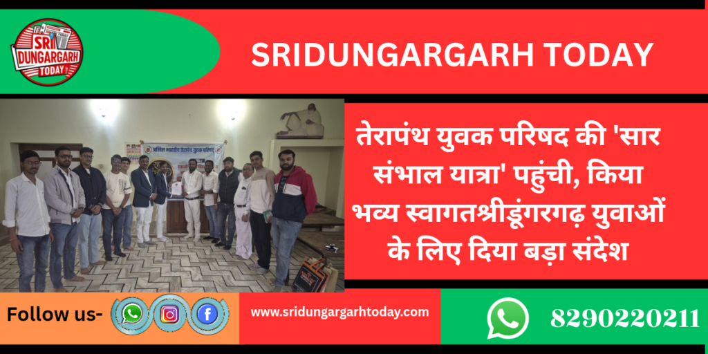अखिल भारतीय तेरापंथ युवक परिषद के तत्वावधान में अभी देश भर में सार सम्भाल यात्रा के तहत शाखा प्रभारी को सशक्त एवं संगठित करने के उद्देश्य से परिषद के शाखा प्रभारी ललित राखेचा एवं विजेंद्र छाजेड़ का श्रीडूंगरगढ़ आगमन हुआ। इस अवसर पर तेयुप व तेकिमं की टीम ने अपने सदस्यों के साथ जैन दुप्पटा पहना कर स्वागत किया।