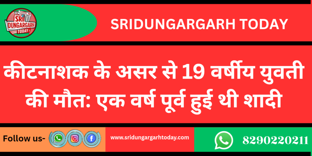 श्रीडूंगरगढ़ क्षेत्र में कीटनाशक के असर से एक 19 वर्षीय युवती ने अपनी जान गवां दी है। गांव सेरूणा की रोही में इसी गांव के निवासी 40 वर्षीय जैनाराम पुत्र सीजीराम जाट ने सेरूणा थाना पुलिस को बताया कि उसकी पुत्री 19 वर्षीय गायत्री 26 जनवरी को खेत में स्प्रे कर रही थी। स्प्रे के असर से उसकी तबीयत बिगड़ गई, जिसे पीबीएम में भर्ती करवाया गया। दौराने ईलाज युवती ने शनिवार को दम तोड़ दिया। पुलिस ने पिता की रिपोर्ट पर मर्ग दर्ज कर शव परिजनों को सौंप दिया। मृतका का विवाह करीब एक साल पहले भोरुणा बीकानेर में किया गया था और मर्ग की जांच नायब तहसीलदार सुरजीत कुमार करेंगे।
