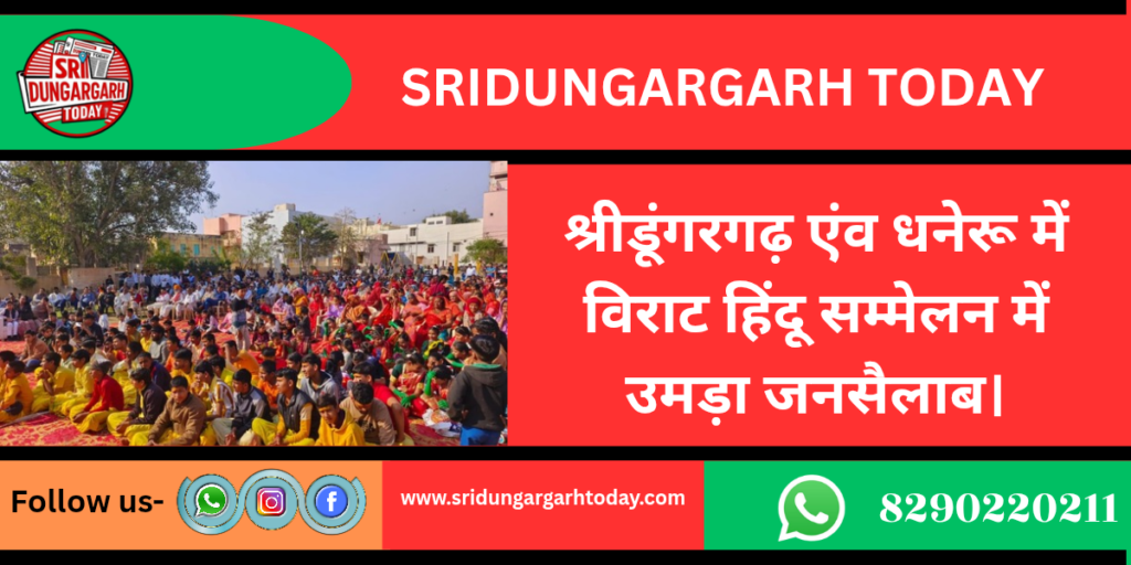 आज श्रीडूंगरगढ़ कस्बे के कालूबास व धनेरू गाँव में विराट हिन्दू सम्मेलन का आयोजन किया गया। धनेरू गाँव में आयोजित सम्मेलन मे राष्ट्रीय स्वयंसेवक संघ के क्षेत्रीय कार्यवाह जसवंत खत्री व मोहन नाथ जी महाराज ने बडी संख्या में पहुंचे ग्रामवासियों को सम्बोधित किया। खत्री ने सम्मेलन में पहुंचे लोगों को सनातन संस्कृति से प्रेरणा लेकर कार्य करने कि आवश्यकता पर बल दिया, उन्होंने कहा कि विश्व में हिन्दू धर्म को विशेष आदर के साथ देखा जाता है और सिर्फ हिन्दू ही ऐसा धर्म है जो पुरे विश्व को अपना सहोदर मानता है। वहीं कालूबास में आयोजित हुए हिन्दू सम्मेलन मे निश्चिल नाथ जी महाराज व नन्दलाल जी बाबा मुख्य वक्ता के तौर पर उपस्थित रहे। निश्चिल नाथ जी महाराज द्वारा संस्कृति को बचाए रखने की आवश्यकता बताते हुए हिंदू संस्कृति की विशेषताओं पर प्रकाश डाला गया।