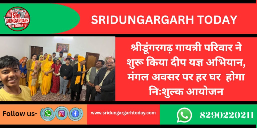 आज के भौतिक युग में जब संस्कारों की बात पीछे छूटती जा रही है, ऐसे समय में गायत्री परिवार श्रीडूंगरगढ़ ने एक सराहनीय और प्रेरणादायक पहल की है। बच्चों व युवाओं में अच्छे संस्कार, सकारात्मक सोच और आध्यात्मिक ऊर्जा के संचार के उद्देश्य से गायत्री परिवार द्वारा “हर घर दीप यज्ञ” अभियान की शुरुआत की गई है।