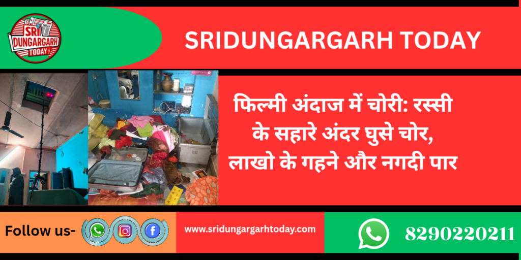 श्रीडूंगरगढ़ क्षेत्र के एक गांव में चोरों के आतंक से ग्रामीण भयभीत हैं। वारदात की खबर फैलने पर हर किसी का दिल बैठ गया है। गांव इंदपालसर, हथाना रोड पर स्थित रामचंद्र पुत्र शेरदास स्वामी की ढाणी में चोरों ने फिल्मी अंदाज में बड़ी चोरी की वारदात को अंजाम दिया। घटना की खबर फैलते ही गांव में सनसनी फैल गई। प्राप्त जानकारी के अनुसार, बीती रात चोर खेत में बने चारागृह की छत पर चढ़े, वहां से घर की छत पर पहुंचे और लोहे का जाल हटाकर रस्सी के सहारे आंगन में उतरे। इसके बाद एक कमरे का ताला तोड़कर सोने-चांदी के गहने और नगदी समेट ली। चोर कमरे में रखी संदूक और अटैचियों को पूरी तरह खंगालकर कीमती सामान लेकर उसी रास्ते से फरार हो गए।
