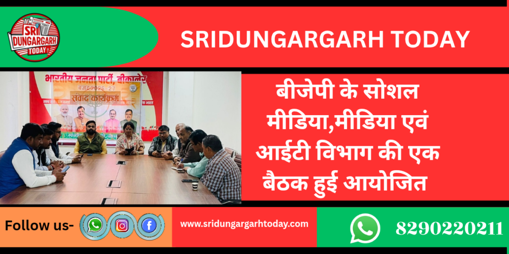 गुरुवार को बीकानेर संभाग कार्यालय में बीकानेर शहर जिला अध्यक्ष सुमन छाजेड़ की अध्यक्षता में भारतीय जनता पार्टी के सोशल मीडिया, मीडिया एवं आईटी विभाग की एक महत्वपूर्ण बैठक आयोजित की गई।