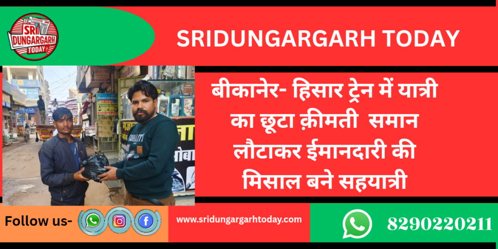 बुधवार शाम बीकानेर -हिसार जाने वाली ट्रेन में यात्रा के दौरान सुरेश कुमार सांसी कितासर बिदावतन का कीमती समान छूट गया था जिस पर ट्रेन में रेगुलर यात्रा करने वाले सक्रिय युवा नीतेश मारू, प्रेम नायक, करण पारीक ने अपने पास सुरक्षित रख लिया था और युवाओ ने श्रीडूंगरगढ़ के सामाजिक कार्यकर्ता श्याम गिरी को सूचना दी गिरी ने अपने स्तर पर खोजबीन शुरू की इसके साथ ही श्रीडूंगरगढ़ टुडे ने खबर को पोर्टल सहित फेसबुक पेज पर प्रमुखता से प्रकाशित किया था। खबर वायरल के साथ सुरेश कुमार ने युवाओं से सम्पर्क किया जिस पर प्रेम नायक ने ईमानदारी की मिशाल पेश करते हुए समान की पहचान कर यात्री को खोया समान का पैकेट लौटा दिया। जिसमें मोबाइल व सोने के आभूषण सहित कुछ जरूरी सामान था सुरेश कुमार सांसी ने सभी का आभार जताते हुए धन्यवाद ज्ञापित किया। श्रीडूंगरगढ़ सामाजिक कार्यकर्ता श्याम गिरी ने नीतेश मारू, प्रेम नायक,करण पारीक को ईमानदारी की राह पर चलने के लिए धन्यवाद देते हुए कहा कि यह एक सकारात्मक और प्रेरक कार्य है, जो सत्यनिष्ठा, नैतिकता और सही आचरण को प्रोत्साहित करता है।