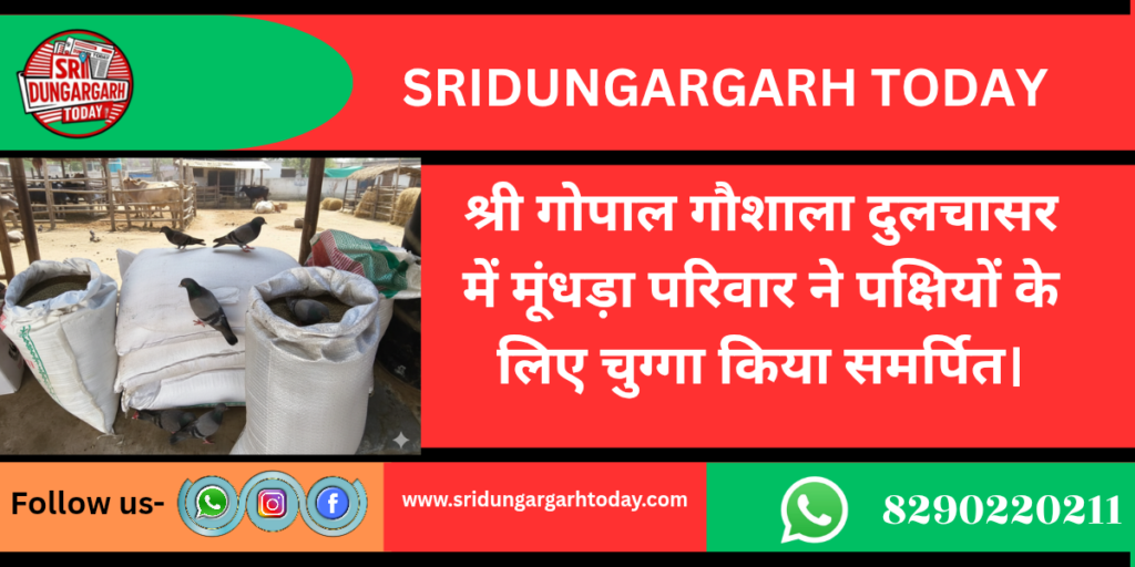 श्री गोपाल गौशाला दुलचासर में पक्षियों के लिए मोतीलाल  मूंधड़ा निवासी दुलचासर प्रवासी मुंबई ने दो क्विंटल ज्वार 50 किलो बाजरी चुग्गा समर्पित किया सचिव रेवंत सिंह पड़िहार ने बताया है कि वहीं  हुकुमचंद मुंधड़ा निवासी दुलचासर प्रवासी मुंबई ने भी एक कट्टा ज्वार और एक कट्टा बाजरी समर्पित किया है।  गौशाला कमेटी ने मूंधड़ा परिवार का आभार व्यक्त कर ईश्वर से सदैव सुख समृद्धि की कामना की।