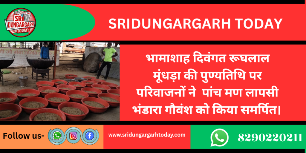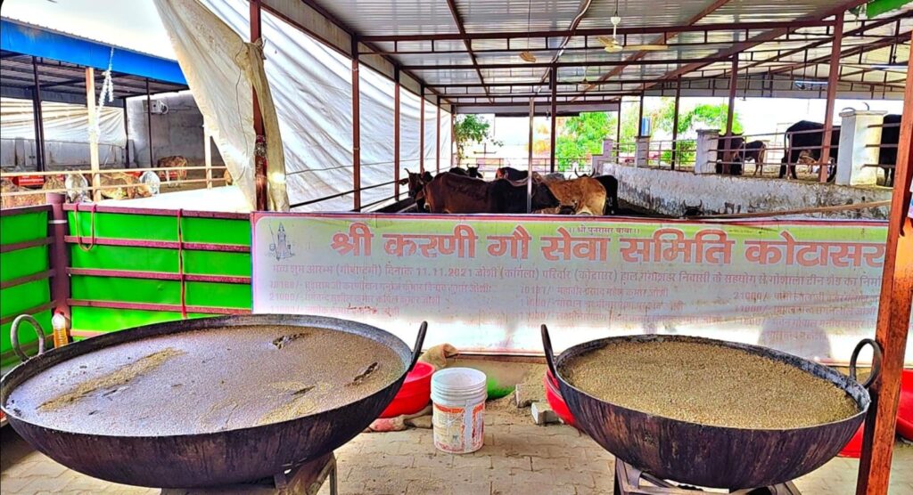 गांव कोटासर की श्री करणी गौशाला में माहेश्वरी समाज के भामाशाह दिवंगत रूघलाल मूंधड़ा दुलचासर की 36वीं पुण्यतिथि पर उनकी धर्मपत्नी पार्वती देवी मूंधड़ा एंव सुपुत्र सुशील कुमार पूनम चंद शिव शंकर संदीप कुमार मूंधड़ा दुलचासर हाल मुंबई ने गोवंश को 5मण लापसी का विशाल भंडारा को ग्रास के रूप में गो माता को समर्पित कर पुण्य आत्मा के शांति की कामना की गौशाला कमेटी ने रुघलाल मूंधड़ा को श्रद्धा सुमन अर्पित करते हुए सादर श्रद्धांजलि अर्पित की गौशाला प्रबंधक ने बताया कि भामाशाह परिवार गौशाला के शुभारंभ से जुड़ा है साथ ही भामाशाह परिवार द्वारा गौशाला में चारदीवारी निर्माण, ट्यूबवेल निर्माण, गो आवास टीन शेड निर्माण, गौशाला में गौ चिकित्सा हेतु मेडिकल स्टोर आदि निर्माण करवाए गए हैं एंव परिवार द्वारा अनवरत गौसेवा जारी है।