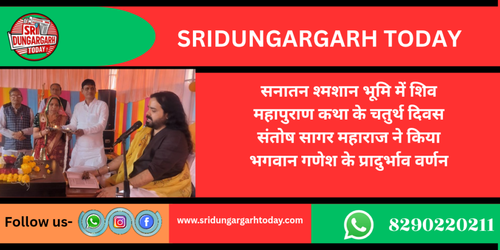 सनातन श्मशान भूमि में गौ-सेवार्थ आयोजित शिव महापुराण कथा के चतुर्थ दिवस पर श्रद्धा और भक्ति का वातावरण बना रहा। व्यास पीठ पर विराजमान कथा वाचक संतोष सागर महाराज ने भगवान गणेश के प्रादुर्भाव की कथा का विस्तार से वर्णन किया। कथा के दौरान महाराज ने गणेश जन्म से जुड़ी पौराणिक घटनाओं को सरल भाषा में समझाते हुए भक्ति, आज्ञा पालन और धर्म के महत्व पर प्रकाश डाला।
