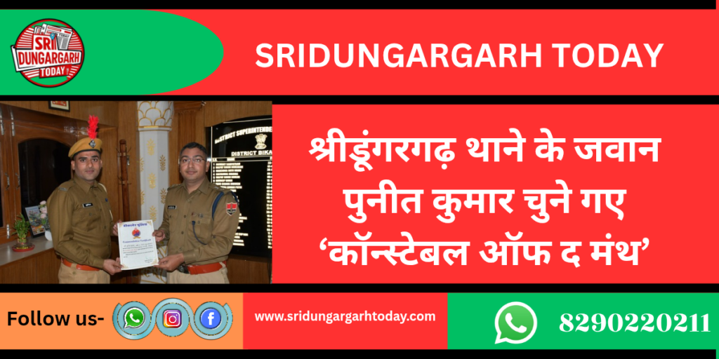 जिला पुलिस अधीक्षक बीकानेर द्वारा फरवरी 2026 माह में उत्कृष्ट कार्य करने वाले पुलिसकर्मियों को सम्मानित करने की कड़ी में श्रीडूंगरगढ़ थाने में तैनात कॉन्स्टेबल पुनीत कुमार को कॉन्स्टेबल ऑफ द मंथ चुना गया है।