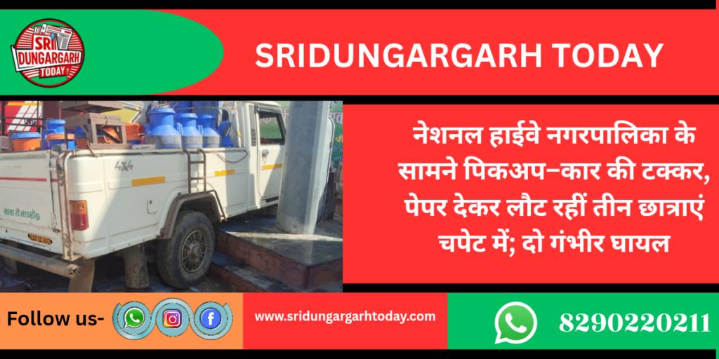 एनएच 11 पर नगरपालिका भवन के सामने सर्विस रोड पर दोपहर सवा एक बजे के लगभग एक दूध की पिकअप और कार की आमने-सामने टक्कर हो गई। हादसे में दोनों वाहनों के चालक घायल हो गए, वहीं पेपर देकर लौट रहीं अमृतवासी की तीन छात्राएं भी चपेट में आकर घायल हो गईं। इनमें से एक छात्रा को सामान्य चोटें आईं, जबकि दो छात्राओं की हालत गंभीर होने पर उन्हें बीकानेर रेफर किया गया है।