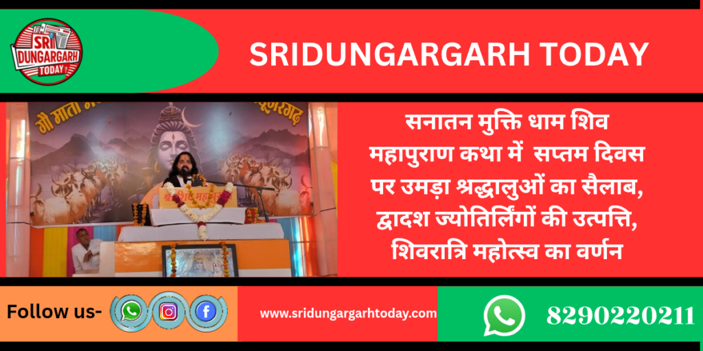 मुक्ति धाम स्थित गौ माता भंडारा गौ-सेवार्थ में आयोजित धार्मिक कथा के सप्तम दिवस पर श्रद्धा, भक्ति और आस्था का अद्भुत संगम देखने को मिला। व्यास पीठ से विराजमान ने अपने ओजस्वी एवं भावपूर्ण प्रवचनों के माध्यम से द्वादश ज्योतिर्लिंगों की उत्पत्ति, उनके पूजन-विधान तथा महाशिवरात्रि पर्व की दिव्य महिमा का विस्तार से वर्णन किया।