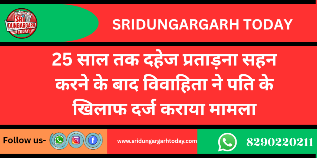 श्रीडूंगरगढ़ क्षेत्र में एक विवाहिता द्वारा करीब 25 वर्षों तक दहेज प्रताड़ना सहने के बाद अपने पति के खिलाफ मामला दर्ज करवाने का मामला सामने आया है। मोमासर बास निवासी परिवादिया बाईला पत्नी बाबूलाल उर्फ बबलू वाल्मिकी ने श्रीडूंगरगढ़ पुलिस थाना में रिपोर्ट दर्ज करवाई है। परिवादिया ने पुलिस को बताया कि उसका विवाह लगभग 25 वर्ष पूर्व आरोपी बबलू से हुआ था। उसके पिता इंद्रचंद वाल्मिकी ने विवाह में गहने, सामान व अन्य उपहार दहेज में दिए थे। आरोप है कि पति ने गहने अपने पास रख लिए और बाद में शराब व जुए में बेच दिए।