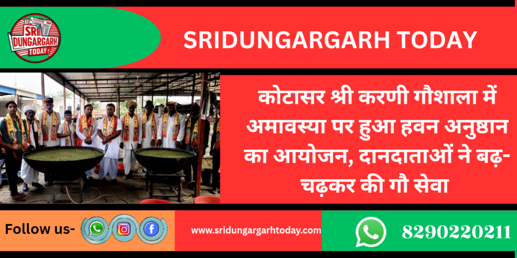 आज अमावस्या के पावन पर्व पर गांव कोटासर की श्री करणी गौशाला परिसर में स्तिथ यज्ञशाला में पंडित सुनील कुमार जाजड़ा एवं पंडित विजय कुमार जाजड़ा दुलचासर ने वैदिक मंत्रोचार के साथ हवन अनुष्ठान संपन्न करवाया ग्राम वासियों ने सामूहिक रूप से विश्व शांति एवं पर्यावरण प्रकृति को शुद्ध रखने के लिए घी खोपरों आहुतियां दी। ततपश्चात महिला सत्संग मंडली के द्वारा भजन कीर्तन के साथ गौ सेवा की गई।