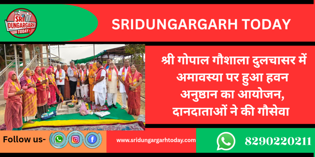 फाल्गुन बदी अमावस्या पर श्री गोपाल गौशाला दुलचासर में हवन अनुष्ठान का आयोजन किया गया। पंडित सुनील कुमार जाजड़ा ने वैदिक मंत्रोच्चार के साथ हवन अनुष्ठान संपन्न करवाया अनुष्ठान में मुख्य यजमान चतर सिंह पड़िहार सपत्नीक , भागीरथ महिया सपत्नीक, गोविंद राम महिया सपत्नीक शामिल हुए।सभी ने घी खोपरो की आहुतियां देकर सुख-समृद्धि की कामाना की। हवन अनुष्ठान के ततपश्चात गौ पूजन का आयोजन किया गया। जिसमें मोतीलाल मूंधड़ा, कुशालचंद मुंधड़ा सपत्नीक शामिल हुए। इस अवसर पर पूर्व सरपंच खेताराम महिया, भंवरलाल दर्जी, किशन लाल सुथार, अशोक सुथार, करणी दान सुथार, खेताराम ओझा, पुनीत ओझा, भैरूदान ओझा, मनोज भार्गव नापासर सहित बड़ी संख्या में ग्रामीण सहित मातृशक्ति उपस्थिति रहे। अखिल भारतीय रामसनेही संप्रदाय पीठ श्री रामधाम दुलचासर एवं श्री जयलमदासजी महाराज मन्दिर के महंत तथा कथावाचक श्री त्रिलोक दास जी महाराज द्वारा बेंगलुरु में श्री राम कथा का वाचन किया जा रहा हैं कथा के दौरान श्रद्धालुओं द्वारा प्राप्त₹ 3570 की श्री गोपाल गौशाला दुलचासर में समर्पित कर गौमाताओं को लापसी का भंडारे का भोग लगवाया भंडारा वितरण में संत शिरोमणि श्रीपरमदास जी ग्रामीण जैसाराम छंरग, रामकिशन महिया ने सहयोग किया। गोपाल सुपुत्र लिखमाराम ने एक बोरी खल, मूंग चूरी, मोडाराम सुथार नागल ने एक बोरी खल, चूरी,एक कटा रसकट गुड़, किशन लाल सुथार ने एक पेटी गुड़ समर्पित किया गौशाला कमेंट ने दानदाताओं का आभार जताकर ईश्वर से सदैव सुख समृद्धि की कामना की।