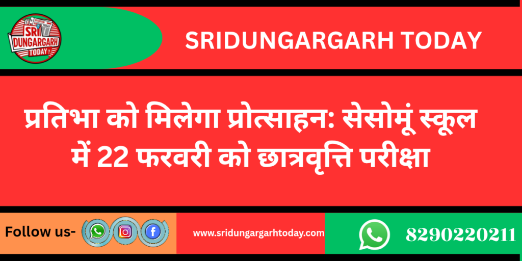 सेसोमूं स्कूल में रविवार, 22 फरवरी 2026 को छात्रवृत्ति परीक्षा का आयोजन किया जाएगा। परीक्षा प्रातः 10 बजे प्रारंभ होगी। यह परीक्षा कक्षा 1 से 9 एवं 11 में प्रवेश लेने वाले विद्यार्थियों के लिए आयोजित की जाएगी।