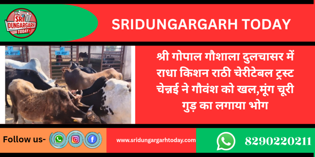 श्री गोपाल गौशाला दुलचासर में रविवार को राधा किशन राठी चेरीटेबल ट्रस्ट, चेन्नई ने गौशाला की गौमाताओं को पौष्टिक आहार खल,मूंग चूरी तथा गुड़ का पावन भंडारा करवा कर भोग लगवाया। सचिव रेवंतसिंह पड़िहार ने बताया कि वहीं मोहित मुंधड़ा ने गौशाला की गौ माताओं को मिठे गुड़ का पावन भोग लगवाया। गौशाला कमेटी ने सभी का आभार प्रकट करते हुए ईश्वर से सदैव सुख समृद्धि कि कामना की।