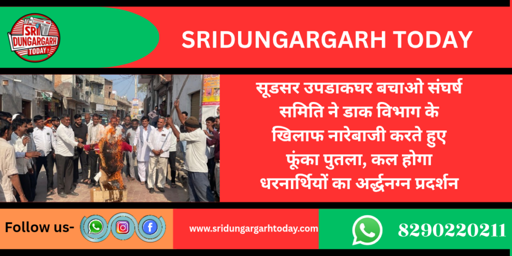 सूडसर में डाक विभाग के खिलाफ ग्रामीणों ने नारेबाजी कर जताया आक्रोश, फूंका पुतला,27 वें दिन भी धरना जारी,कल होगा धरनार्थियों की ओर से अर्द्ध नग्न प्रदर्शन