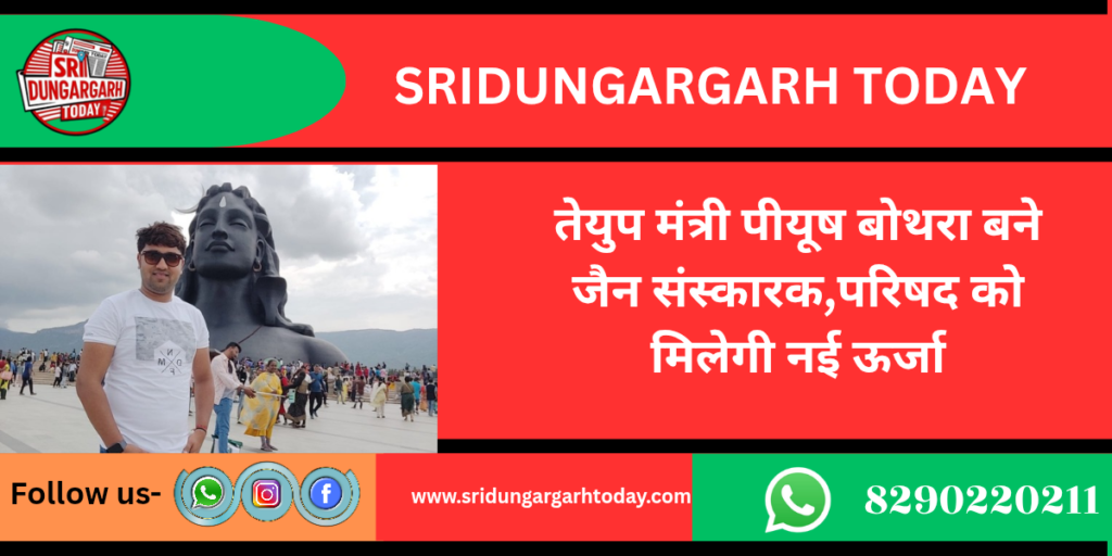 हाल ही में आयोजित अखिल भारतीय तेरापंथ युवक परिषद् के निर्देशन में सत्र 2025-27 में जैन संस्कार विधि प्रथम ऑनलाइन संस्कारक प्रशिक्षण एवं निर्माण कार्यशाला में देश-विदेश से अनेक प्रतिभागियों ने सहभागिता निभाई। इस प्रशिक्षण के पश्चात श्रीडूंगरगढ़ के मंत्री पीयूष बोथरा का जैन संस्कारक के रूप में चयन होना परिषद् एवं समस्त समाज के लिए अत्यंत गौरव का विषय है।