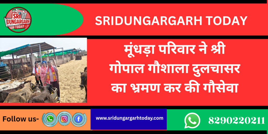सूडसर निवासी चांदमल मुंधड़ा के सुपुत्र महेश कुमार मूंधड़ा अपनी धर्मपत्नी श्रीमती विनीता सुपुत्री निशा मुंधड़ा के साथ श्री गोपाल गौशाला दुलचासर में पधारकर गौशाला का भ्रमण कर अवलोकन किया इस अवसर पर गौमाताओं को पौष्टिक आहार खल, मूंग चूरी तथा गुड़ का पावन भंडारा करवा कर अपने हाथों से भोग लगाया। सचिव रेवंतसिंह पड़िहार ने बताया कि मुंधड़ा परिवार समय- समय पर गौशाला में पधारकर गौ सेवा करते रहते हैं। गौशाला कमेटी ने मुंधड़ा परिवार का आभार प्रकट करते हुए ईश्वर से सदैव सुख समृद्धि कि कामना की।