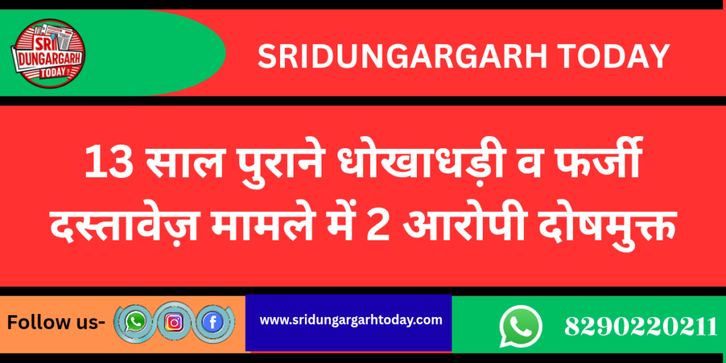 श्रीडूंगरगढ़ एसीजेएम न्यायालय ने 13 वर्ष पुराने धोखाधड़ी एवं दस्तावेज़ों की कूटरचना के एक मामले में फैसला सुनाते हुए दो आरोपियों को दोषमुक्त कर दिया। निर्णय अतिरिक्त मुख्य न्यायिक मजिस्ट्रेट हर्ष कुमार द्वारा सुनाया गया।