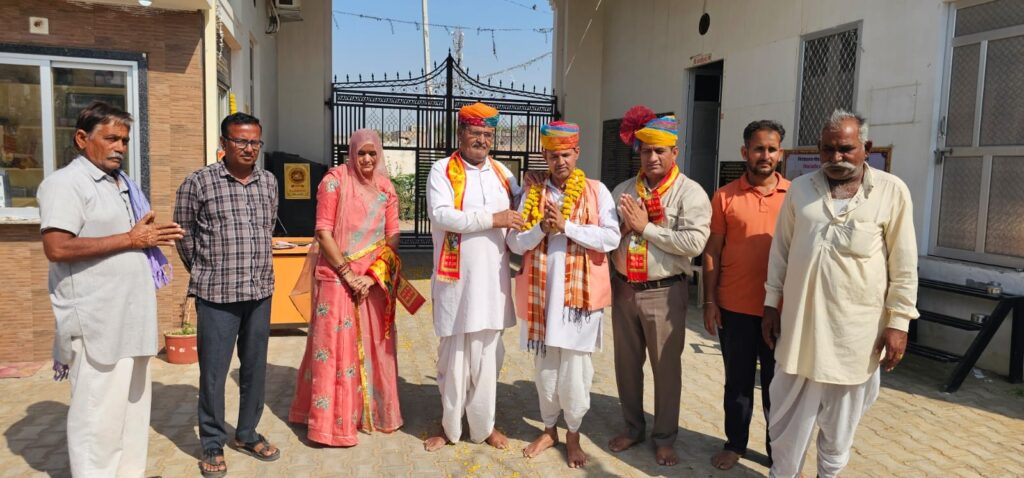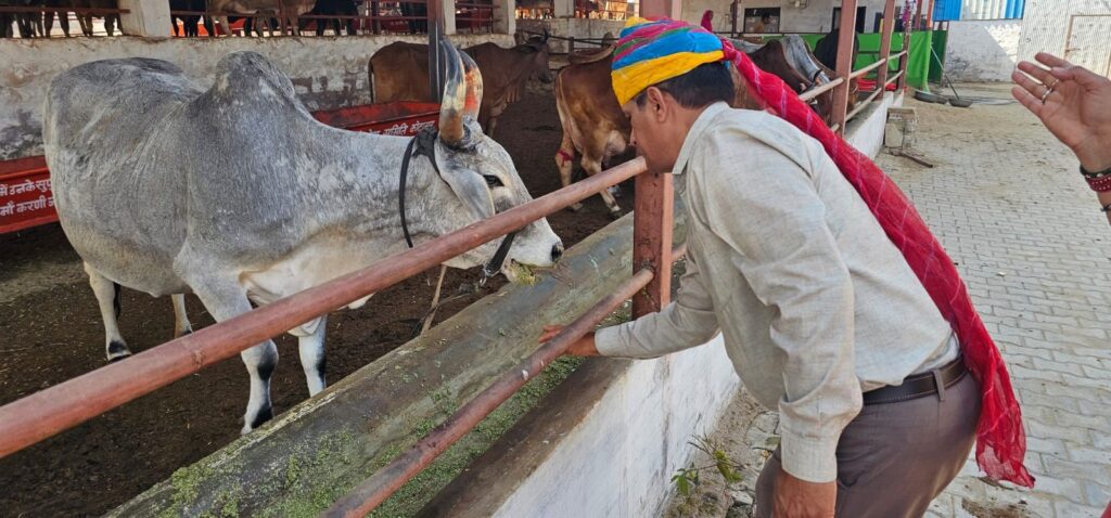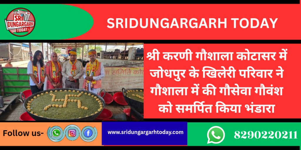 श्री करणी गो सेवा समिति गौशाला कोटासर में शनिवार को जोधपुर के “स्वीकार लैंडमार्क” के एमडी परम गौ भक्त, भामाशाह राजकुमार खिलेरी अपनी धर्मपत्नी श्रीमती रेनू देवी एंव सुपुत्री पूजा तथा सुपुत्र पृथ्वीराज खिलेरी परिवार सहित गौशाला पधार कर गौशाला स्थित मां करणी के दिव्य दर्शन कर पूजार्चना की। इस दौरान संत श्री जयमल दास जी महाराज दुलचासर पीठ के महंत श्री त्रिलोक दास जी महाराज का आगमन हुआ पूज्य महंत जी के पावन सानिध्य में विशाल गौ सेवा भंडारा गौ माताओं को समर्पित किया गया। कमेटी ने बताया कि गत दिनों में बेंगलुरु की पावन धरा पर श्री राम कथा का दिव्य अनुष्ठान हुआ कथा का वाचन कथावाचक महंत श्री तिलोक दास जी महाराज ने किया जिसमें राजकुमार खिलेरी ने मुख्य यजमान के रूप में सोभाग्य प्राप्त किया।कथा के दौरान राजकुमार ने गौ सेवा का संकल्प लिया था संकल्पित सेवा आज गौशाला में समर्पित की गई इस अवसर पर गौशाला के भामाशाह पेमाराम गोदारा, श्रीभगवान सैन, धर्मेंद्र स्वामी दुलचासर भी उपस्थित रहे। गौशाला कमेटी द्वारा पधारे हुए सभी अतिथियों एंव संतों का पुष्प वर्षा कर स्वागत किया। तथा माला दुपट्टा पहनाकर एवं गौशाला स्मृति चिन्ह भेंट कर सम्मान किया। भामाशाह राजकुमार खिलेरी आज प्रथम बार गौशाला पधारे और गौशाला विकास हेतु विशेष चर्चा करते मार्गदर्शन किया। कमेटी ने बताया कि गौशाला परिवार ने आशा जताई की आगामी दिनों में गौशाला और ज्यादा विकसित होने की संभावना बनी रही है। गौशाला कमेटी ने राजकुमार खिलेरी का आभार व्यक्त करते हुए धन्यवाद ज्ञापित किया।