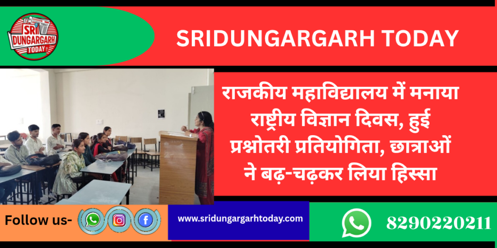 राजकीय महाविद्यालय श्रीडूंगरगढ़ में राष्ट्रीय विज्ञान दिवस 2026 उत्साहपूर्वक मनाया गया। भारत सरकार द्वारा इस वर्ष की थीम “Women in Science: Catalysing Viksit Bharat” रखी गई, जिसके तहत महाविद्यालय में प्रश्नोतरी प्रतियोगिता का आयोजन किया गया।