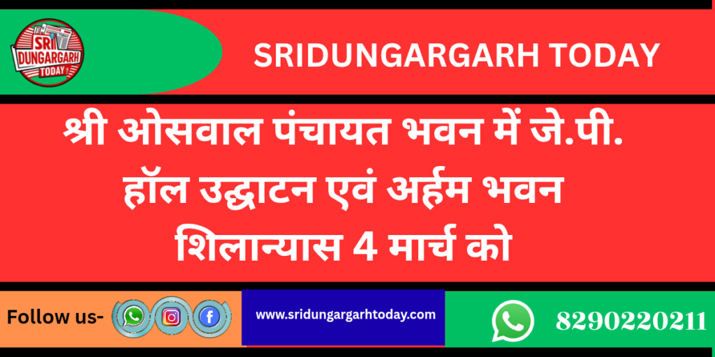 समारोह कार्यक्रम 04 मार्च 2026, प्रातः 8:00 बजे श्री ओसवाल पंचायत भवन, कालू बास, श्री डूंगरगढ़ (बीकानेर) में आयोजित होगा।