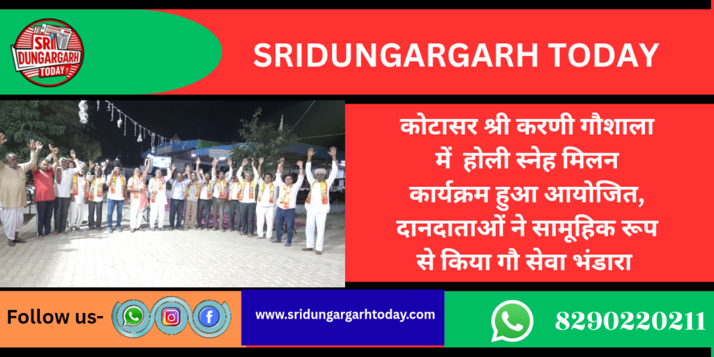 होली के रामा श्यामा के अवसर पर गौशाला कमेटी, ग्राम वासियों ने एवं गौशाला से जुड़े हुए भामाशाहों स्नेह मिलन कार्यक्रम आयोजित हुआ सभी ने भी एक दूसरे को होली की बधाई देते हुए गोमाताओं को गुड़ खल मूंग चूरी का भंडारा समर्पित कर होली का पर्व मनाया स्नेह मिलन कार्यक्रम में मुख्य अतिथि के रूप में सीए हीरालाल सुथार दुलचासर दिल्ली प्रवासी गोपाल माहिया दुलचासर मास्टर देवीलाल छरंग दुलचासर, करणीदान सुथार दुलचासर राजाराम सुथार, कोजाराम सुथार, गोविंद राम महिया, श्री भगवान सेन, धर्मेंद्र स्वामी दुलचासर सहित सभी अतिथियों को गौशाला परिवार की ओर से दुपट्टे पहनाकर सम्मान करते हुए जताया आभार।