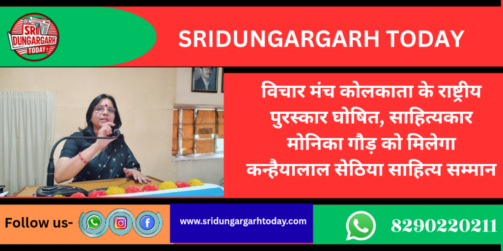 सामाजिक सरोकारों के क्षेत्र में पूरे देश में अपनी विशिष्ट पहचान रखने वाली कोलकाता की संस्था विचार मंच द्वारा वर्ष 2026 के राष्ट्रीय पुरस्कारों एवं सम्मानों की घोषणा कर दी गई है। इस आशय की जानकारी देते हुए संस्थान के मंत्री प्रदीप पटवा ने बताया कि समग्र साहित्यिक अवदान के लिए अर्पित किया जाने वाला वर्ष 2026 का प्रतिष्ठित “कन्हैयालाल सेठिया साहित्य सम्मान” इस वर्ष बीकानेर की वरिष्ठ साहित्यकार, समालोचक एवं साहित्यिक आयोजनों की कुशल संचालक मोनिका गौड़ को प्रदान किया जाएगा। विचार मंच प्रतिवर्ष विभिन्न क्षेत्रों में उत्कृष्ट कार्य करने वाली प्रतिभाओं को सम्मानित करता है। आयोजक संस्था के अध्यक्ष सरदारमल कांकरिया ने बताया कि एस पी के जैन फ्यूचररिस्टिक अकादमी, कोलकाता में रविवार, 15 मार्च को प्रख्यात उद्योगपति एवं समाजसेवी हरिप्रसाद बुधिया की अध्यक्षता और प्रमोद कुमार सराफ के मुख्य आतिथ्य में आयोज्य समारोह में श्रीमती गौड़ को एक लाख रुपये की नकद राशि एवं सम्मान-पत्र और स्मृति चिह्न प्रदान कर समादृत किया जायेगा।