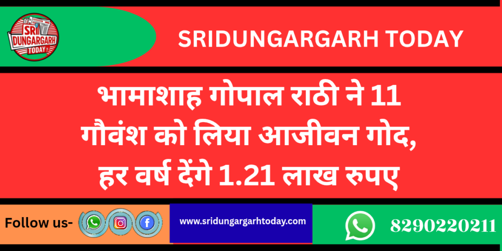 कस्बे की जीव दया गौशाला में अपनी मातृ भूमि व गौ माता के प्रति सेवाभाव की प्रेरणादायक मिसाल पेश करते हुए भामाशाह श्रीगोपाल राठी (श्रीडूंगरगढ़- नागपुर) ने रामचंद्र राठी की प्रेरणा से गौशाला पहुंचकर 11 गौवंश को आजीवन गोद लिया। इसके तहत वे प्रतिवर्ष 1 लाख 21 हजार रुपए का दान गौशाला को देंगे।