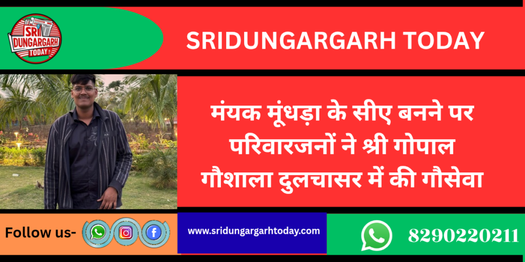विनोद कुमार सुपुत्र फुसराज मुंधड़ा निवासी दुलचासर प्रवासी ओडिशा ने अपने सुपुत्र मयंक मुंधड़ा के सी, ए, बनने पर श्री गोपाल गौशाला दुलचासर में गौ माताओं को पौष्टिक आहार बिनोला खल मूंग चूरी तथा गुड़ का पावन भंडारा करवा कर भोग लगवाया है सचिव रेवंतसिंह पड़िहार ने बताया कि मुंधड़ा परिवार ने रु 4100/-की पावन राशि भी समर्पित की है। गौशाला समिति ने मुंधड़ा परिवार का आभार प्रकट करते हुए ईश्वर से सदैव सुख समृद्धि कि कामना की है।